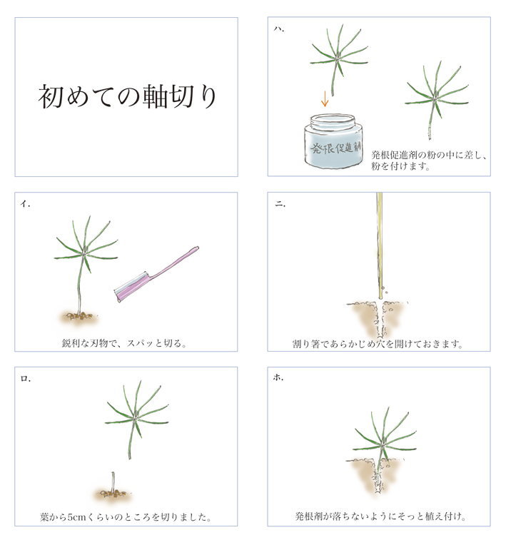 「軸切り」とは苗の根張りをよくし、盆栽に適したものにする為に行うとの事。