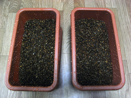 なんとも味気ない画像になりましたが、このように二つのプランターに蒔いてみました。何故二つに分けたかといいますと、管理場所を二つに分けて発芽の確立を高くしてみたかったからです(どんな条件が適しているかわからないので)。一つはベランダにもう一つは室内で。