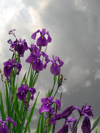 画像は沼の渕に植えられたハナショウブです。ちょっと不思議な感じに映っていませんか?背景は空ではなく水面なのです!