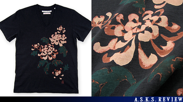 この「菊花」、とても趣のあるプリントに仕上がりました!一見すると手描き?かなと思ってしまうような奥深い表情があります。ちょっと探してもこんなプリントTシャツはみつけられないのではと我ながら感じます。