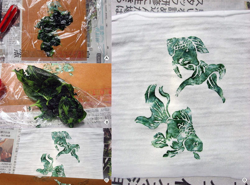 B.硬い台の上に新聞を敷き、その上に染めたいもの(今回は水墨画の半紙)を敷き、さらにその上に藍の葉を並べ、何となくラップをかけた上からハンマー(木槌が良いと思います)でひたすらたたきます。