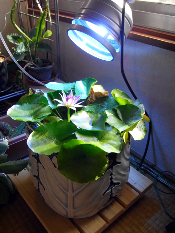 睡蓮はもともと強い日光を好む植物で、ウチのひさしの張り出た日照不足のベランダでは育てられないだろうなと、室内で管理する事に決めました。