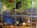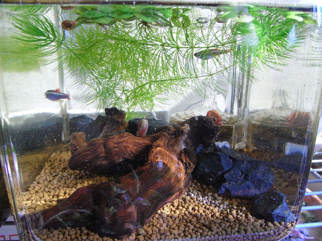 友人のお言葉やその後、軽い勉強の結果、画像のような水槽レイアウトにしましたよ。本当は何も入れないほうが、泳ぎの上手でないらんちゅうちゃんたちには良いらしいのですが、それではさみしいので…。
