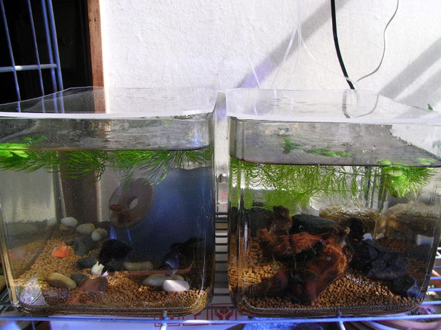 ちなみにひっくり返っているブルーのは植木鉢です。底をリューターで丁寧に削り、ツルツルにしてらんちゅうに傷がつかないよう配慮しています。
